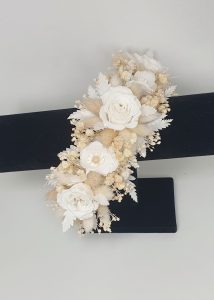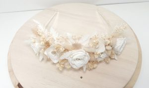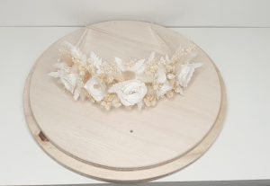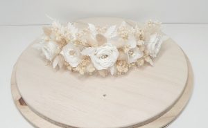 Coronita decorata cu flori uscate si criogenate, contine 3 trandafiri de 2 cm, hortensie si floarea miresei criogenata. Culori predominante crem, ivoire si alb.