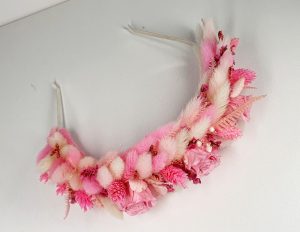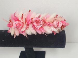 Coronita (accesoriu par) decorata cu flori uscate si criogenate ce contine 3 trandafiri de 1 cm, hortensie si alte flori criogenate. Culori predominante roz pal si ivoire.
