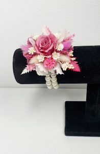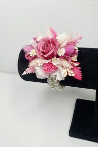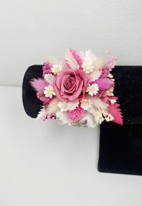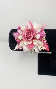 Corsaj mic realizat din flori criogenate si uscate, ce conține un trandafir de 1 cm. Culori predominante roz-spuma-vin, roz-baby, alb și ivoire.