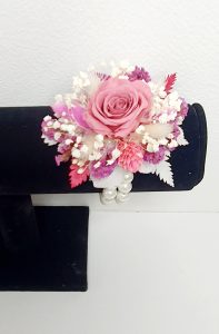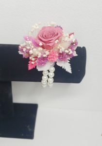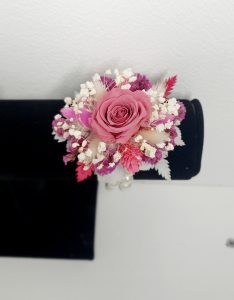 Corsaj mic realizat cu flori uscate si criogenate, ce contine un trandafir de 1 cm. Culori predominante roz-spuma-vin, roz-intens, ivoire si alb.