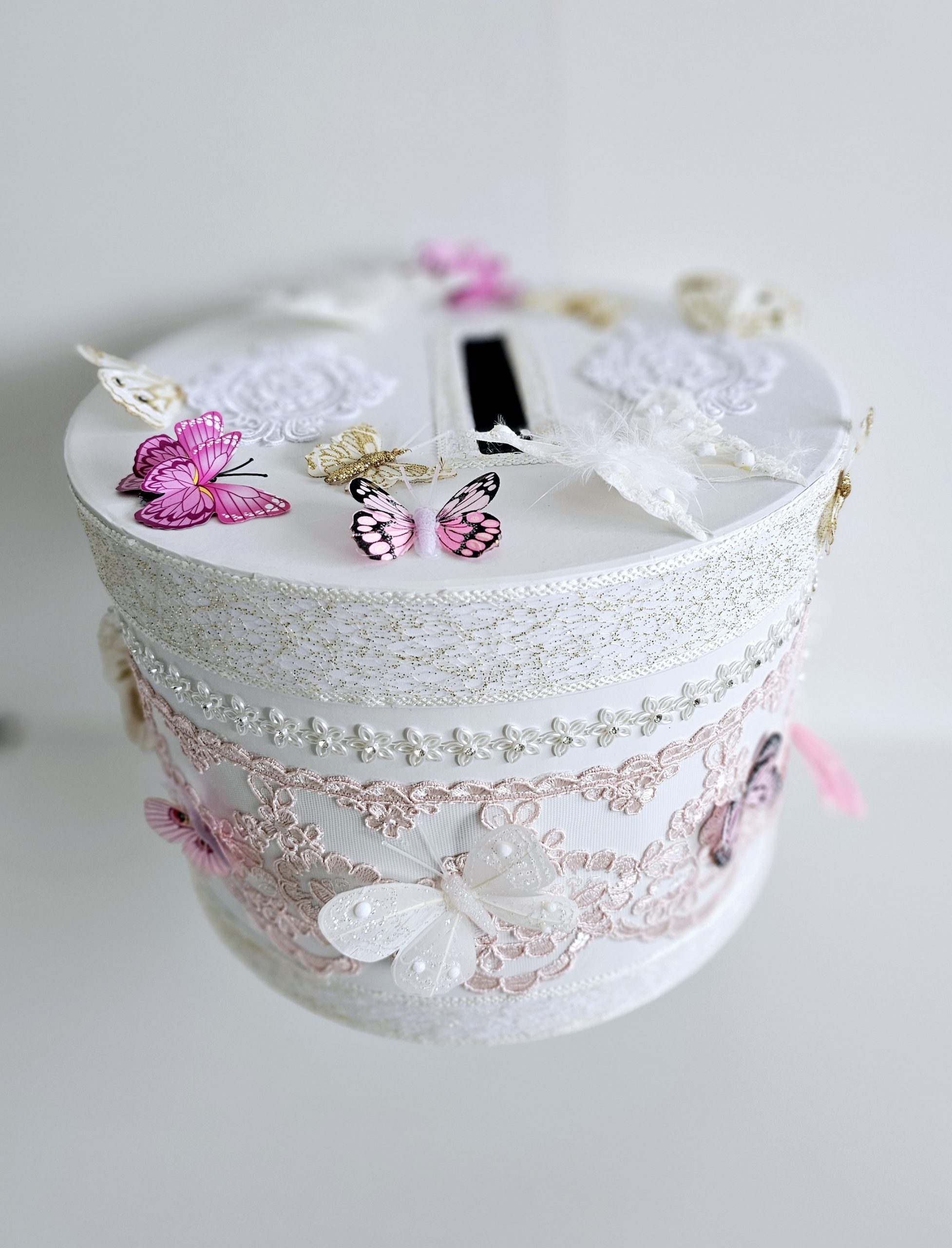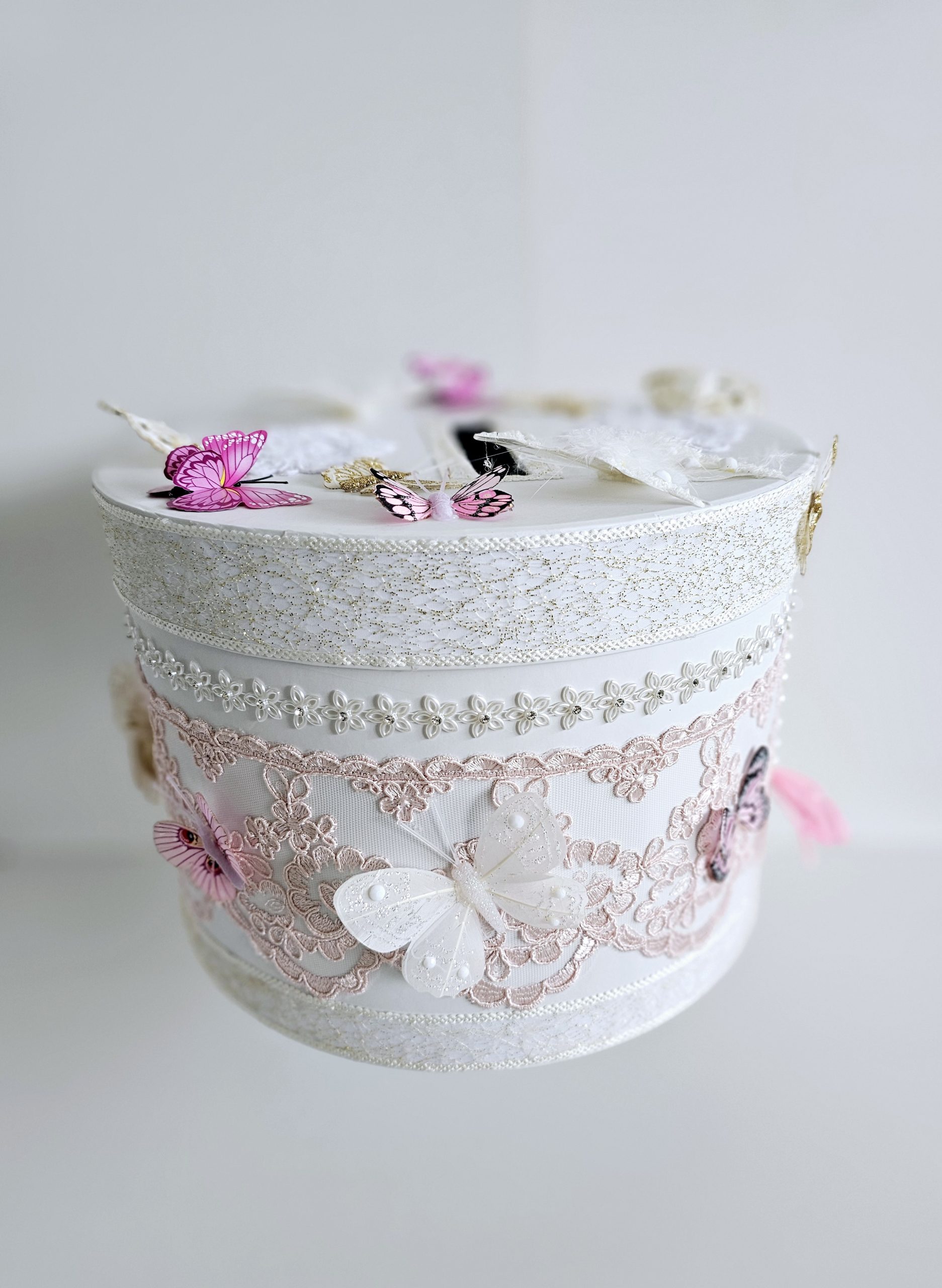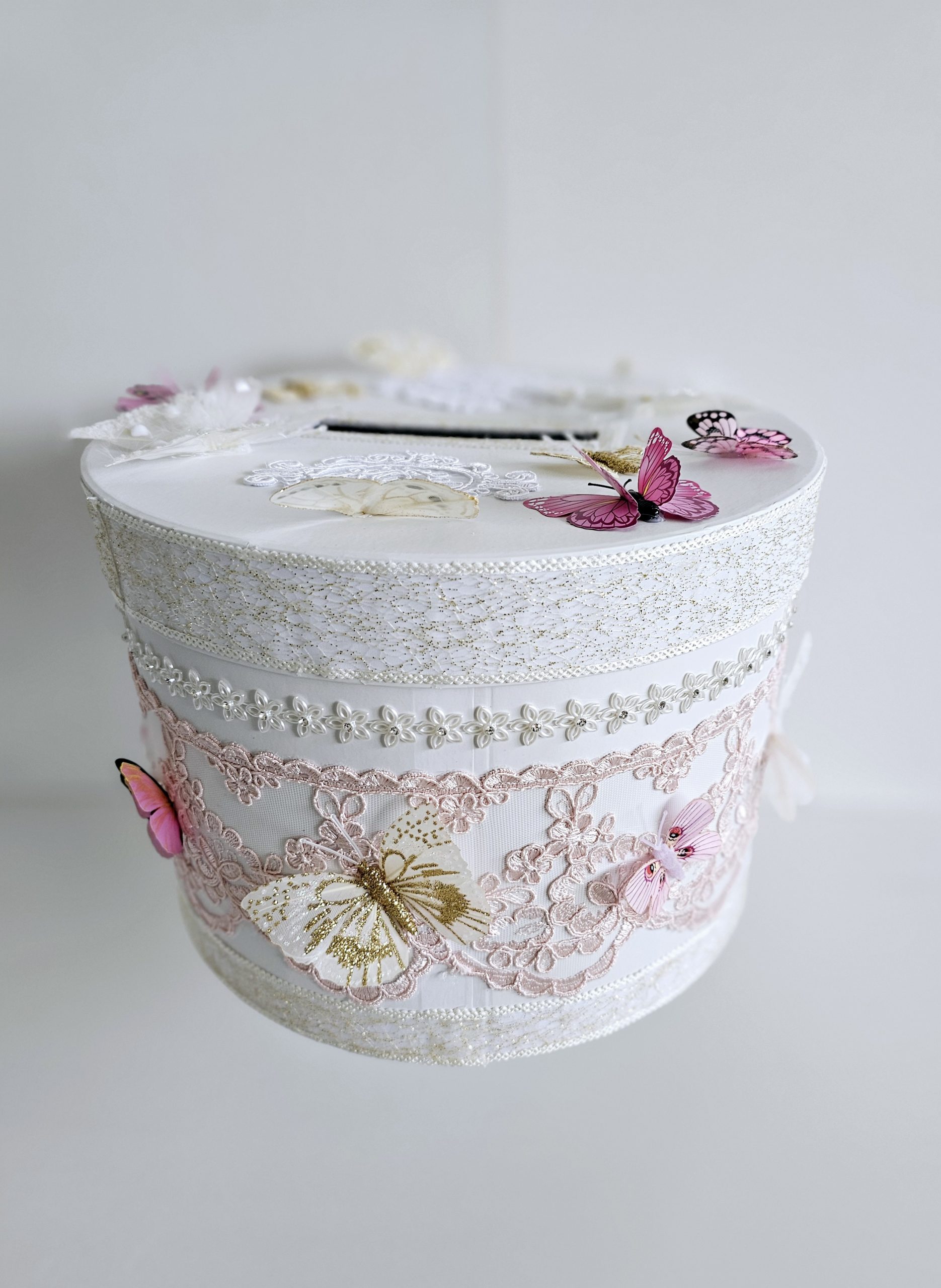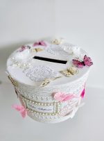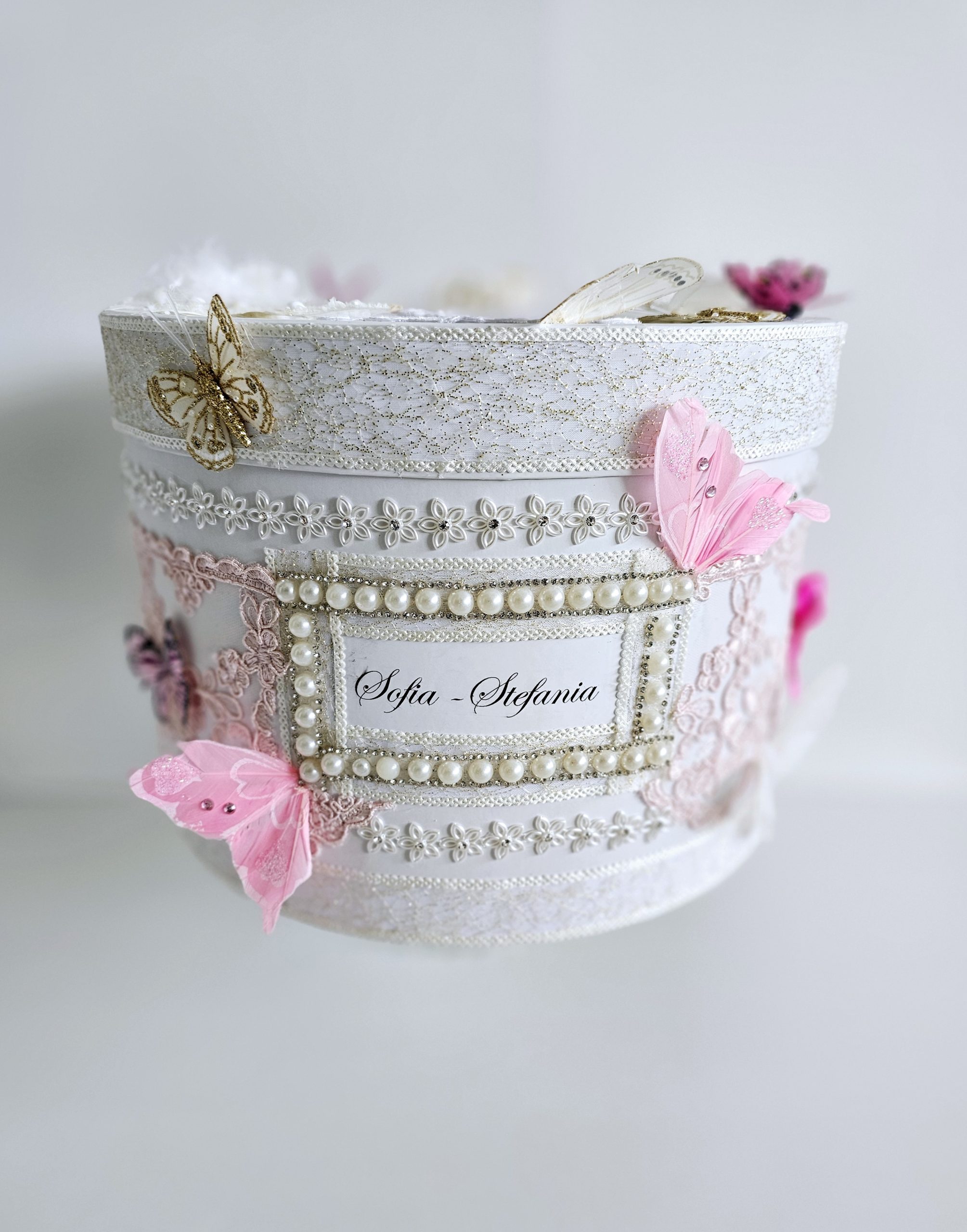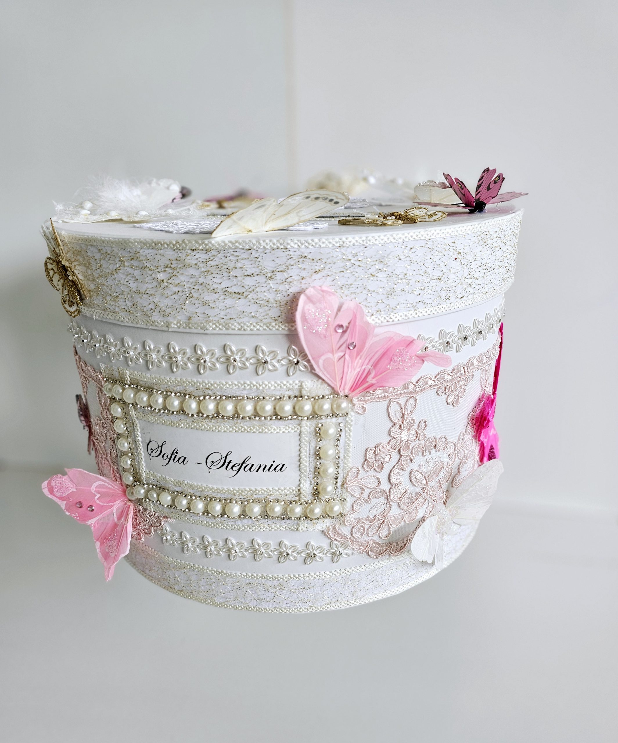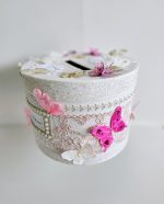 Cutie de dar personalizata si decorata cu dantela, strasuri si fluturi.