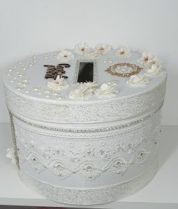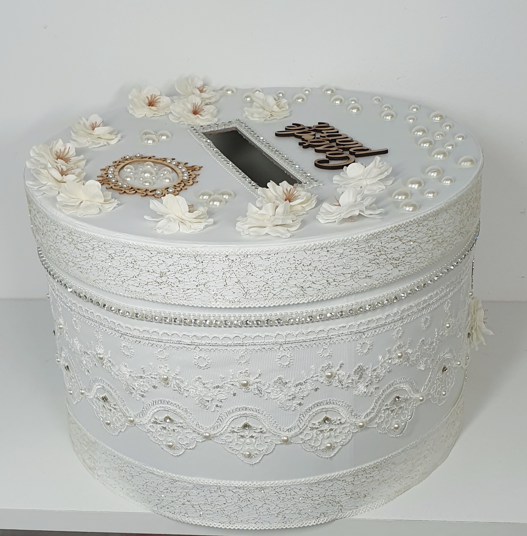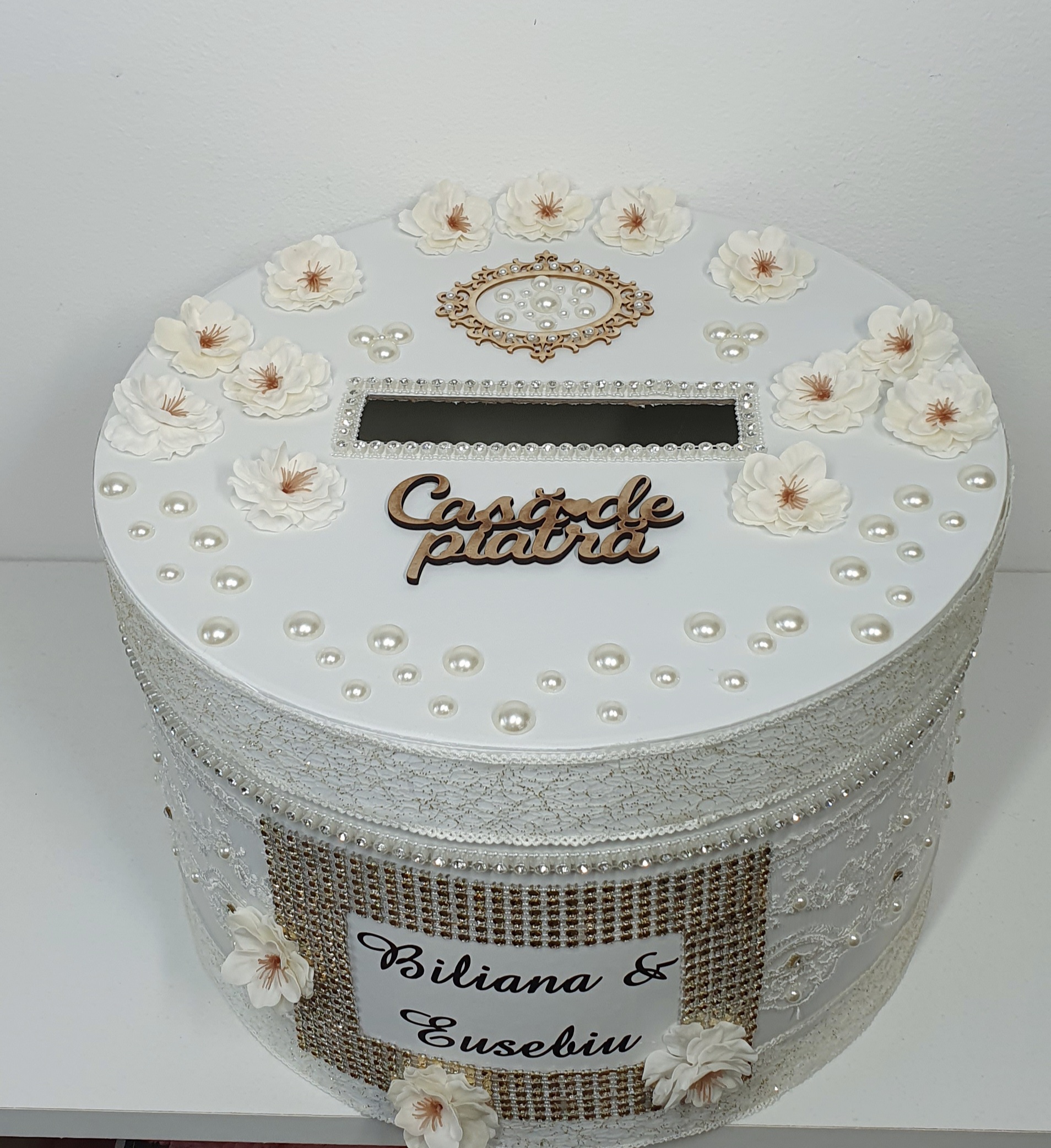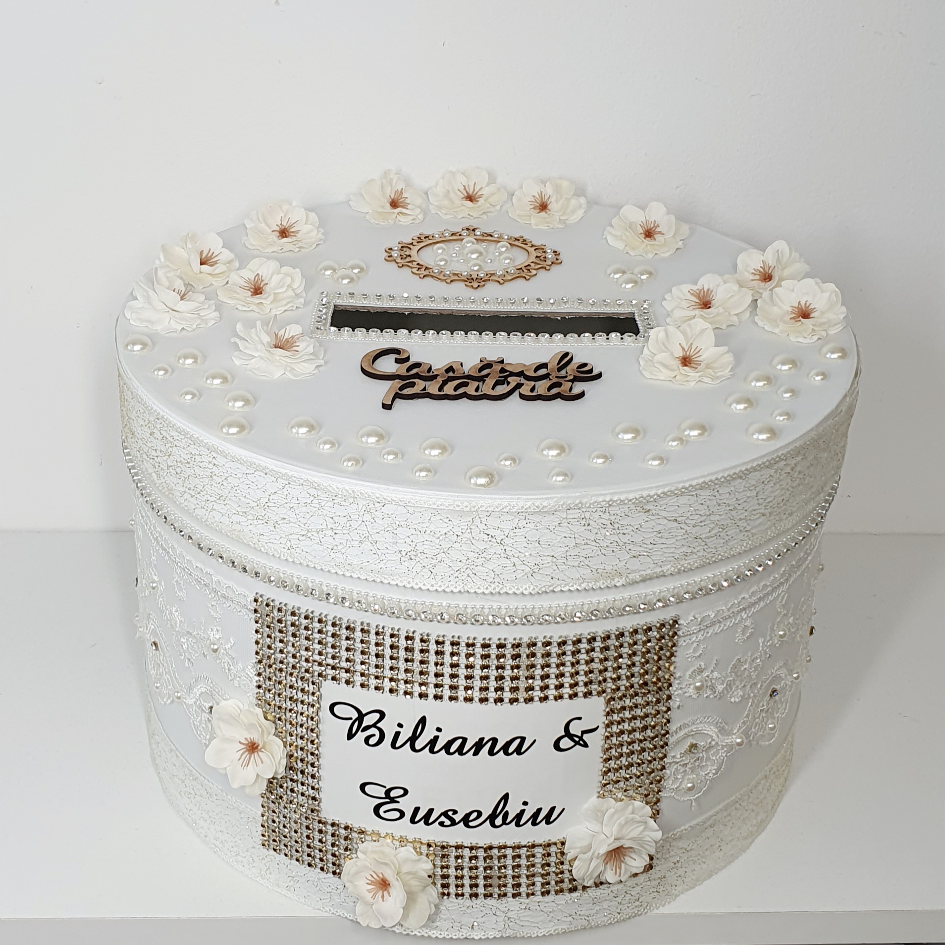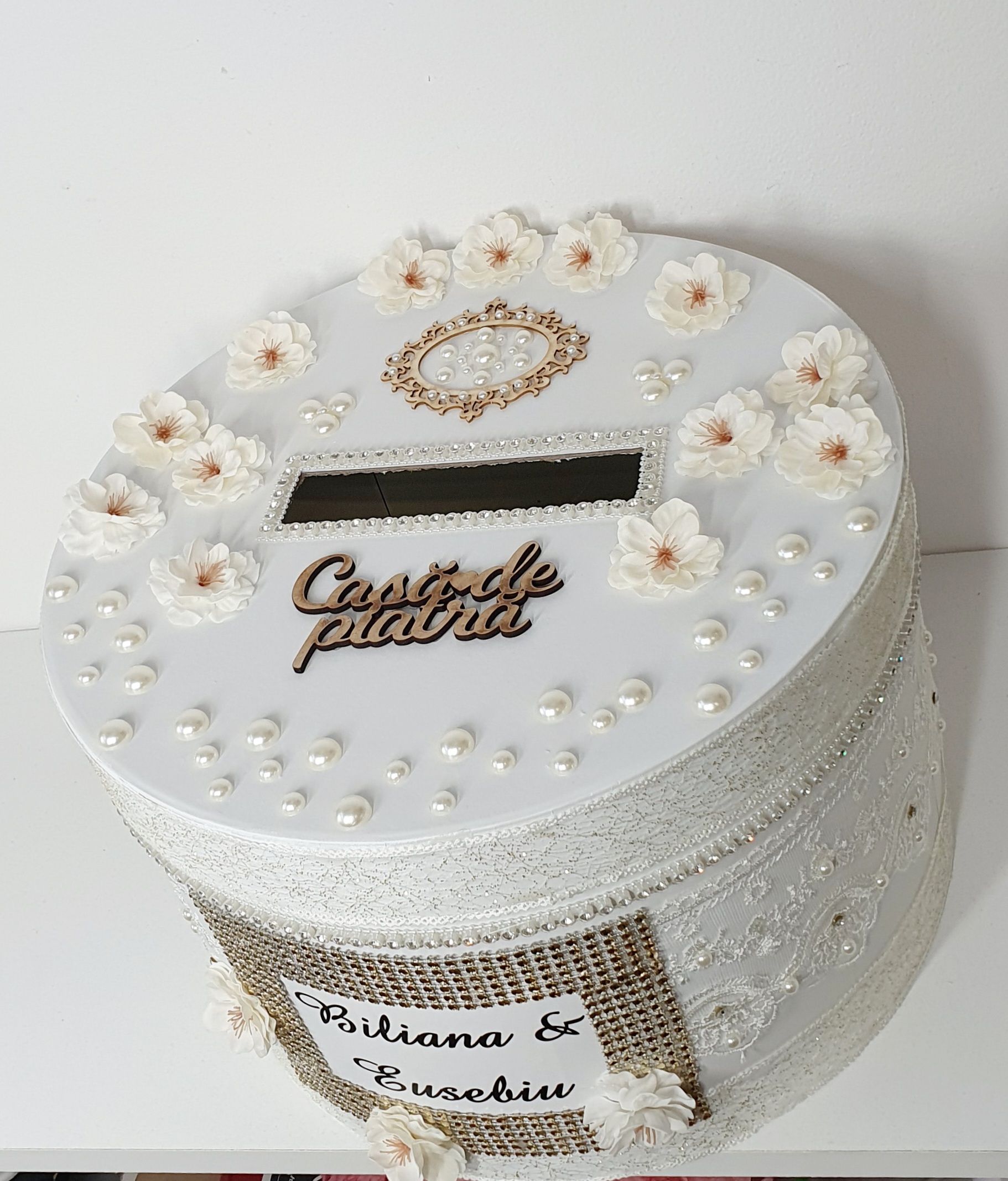 Cutie de dar alba decorata cu diverse accesorii (strasuri si dantela, flori artificiale/sapun) personalizata (numele mirilor si data evenimentului).