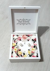 Cutie de verighete se poate personaliza cu numele mirilor sau numele mirilor si data evenimentului fie cu diferite mesaje (scurte- in interiorul cutiei).