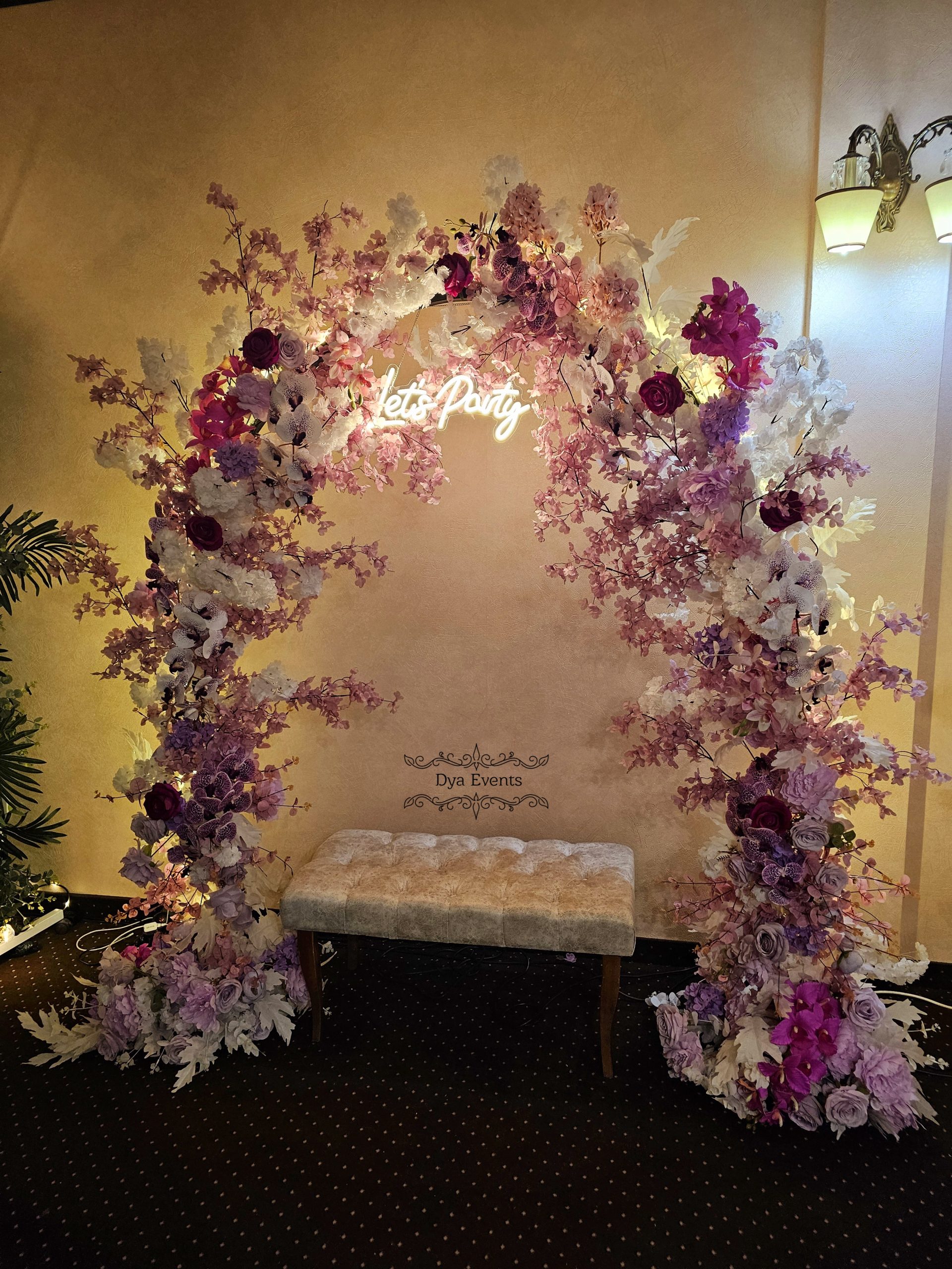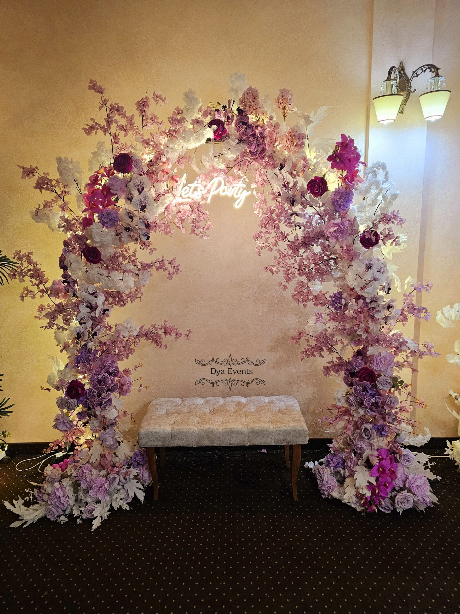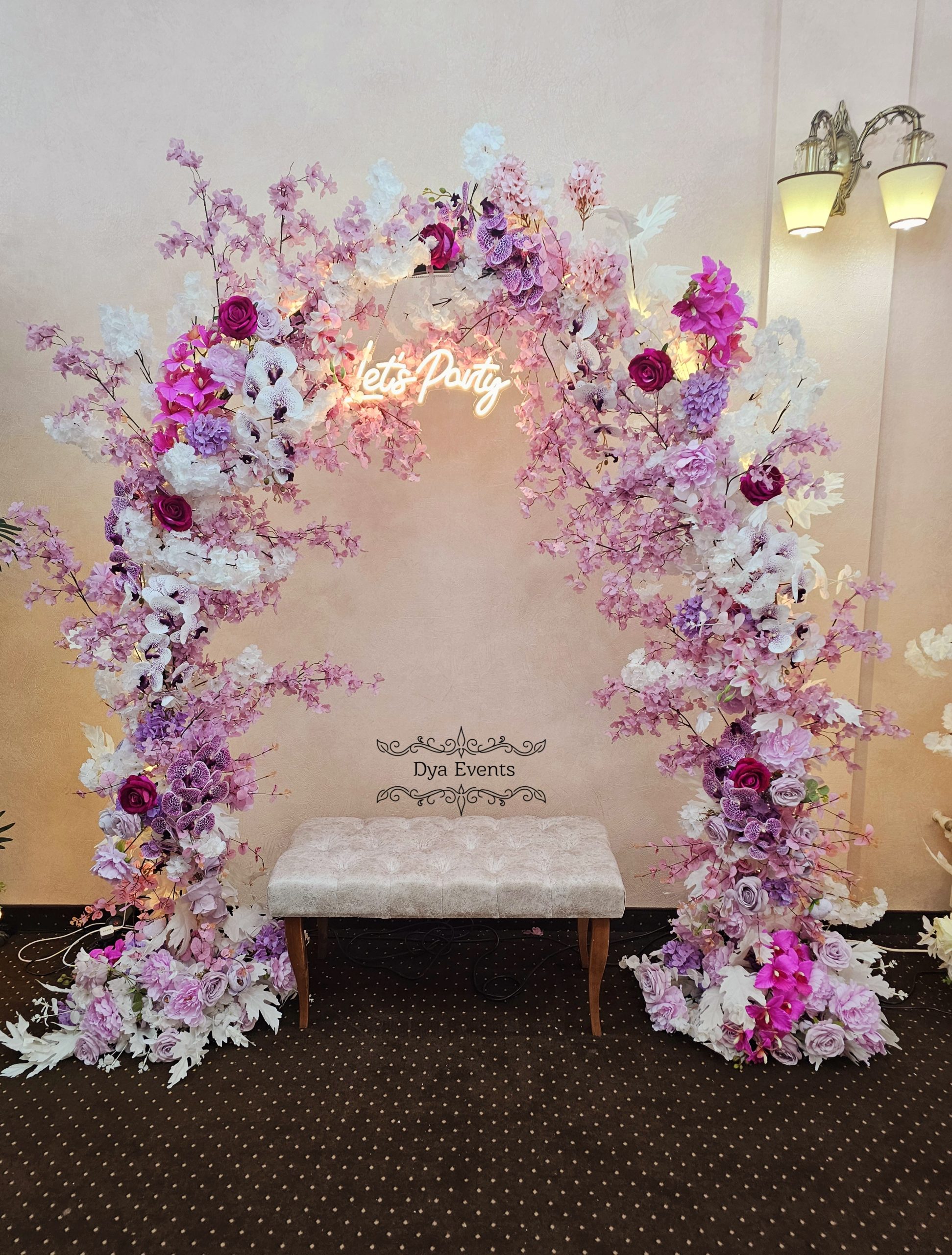 Arcada metalica cu flori artificiale si ghirlanda luminoasa (de inchiriat)