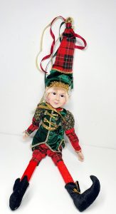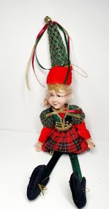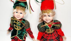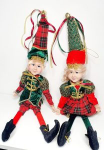 Decoratiune de Craciun sub forma de elfi (set), de culoare rosu si verde cu diverse decoratiuni, paiete si clopotei.