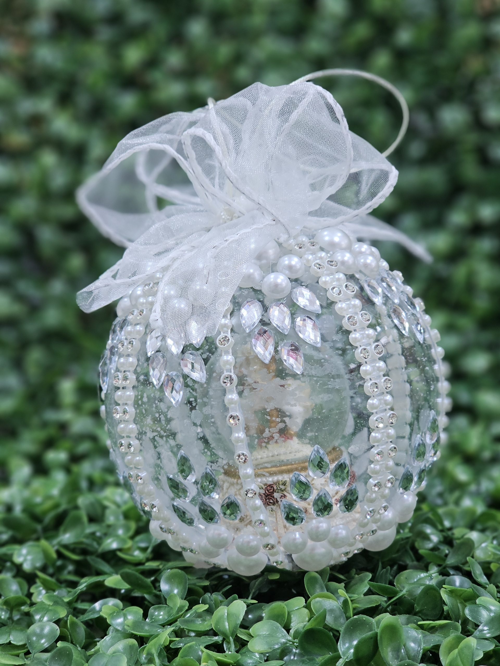 Glob de Craciun decorat cu strasuri si perle, ce are in interiorul lui un alt glob cu carusel in el.