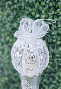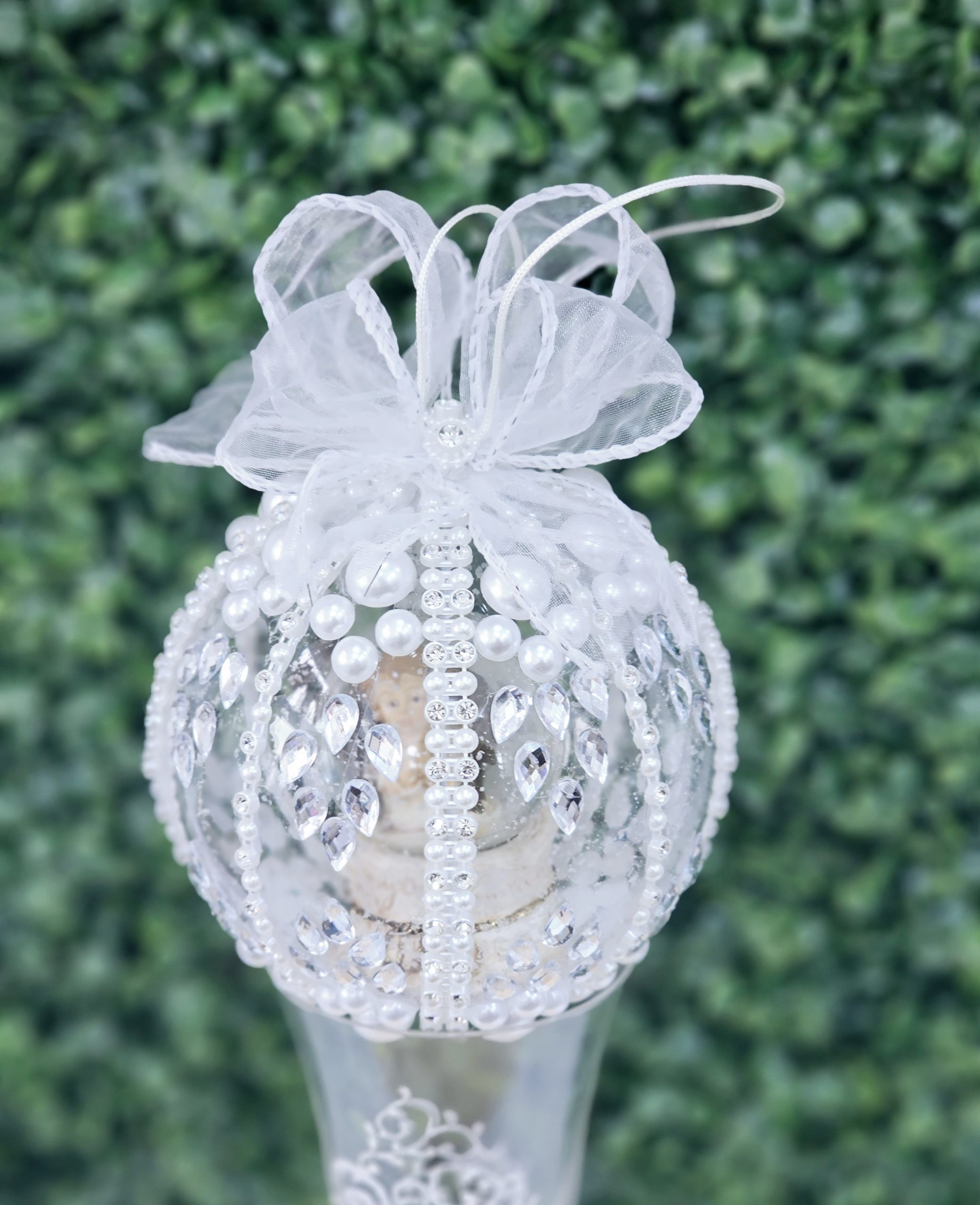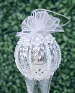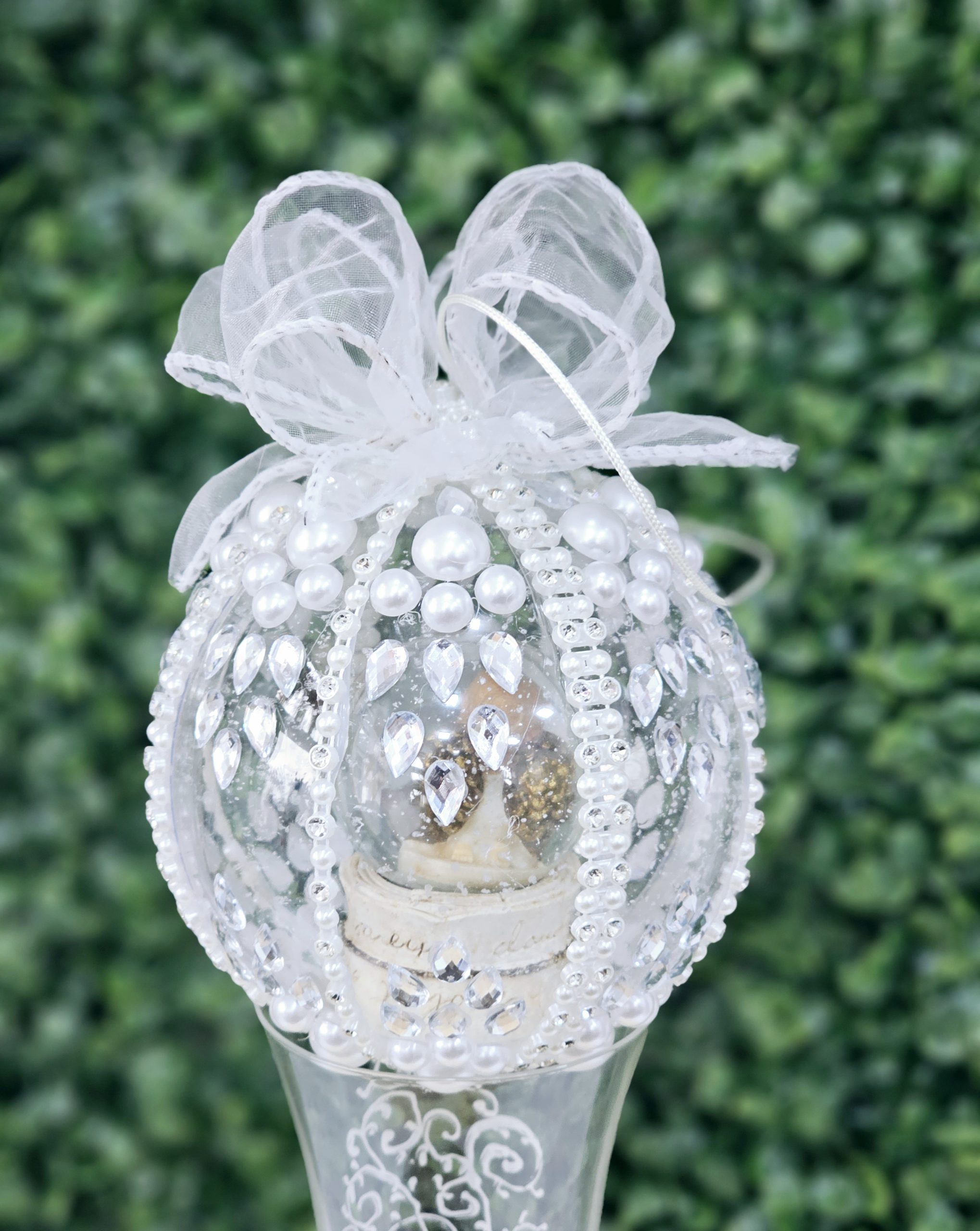 Glob de Craciun, decorat cu strasuri si perle si diverse ornamente de Craciun.