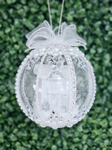 Glob de Craciun decorat cu strasuri si perle. In interiorul globului se afla o casuta in miniatura.