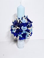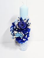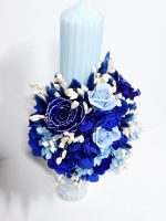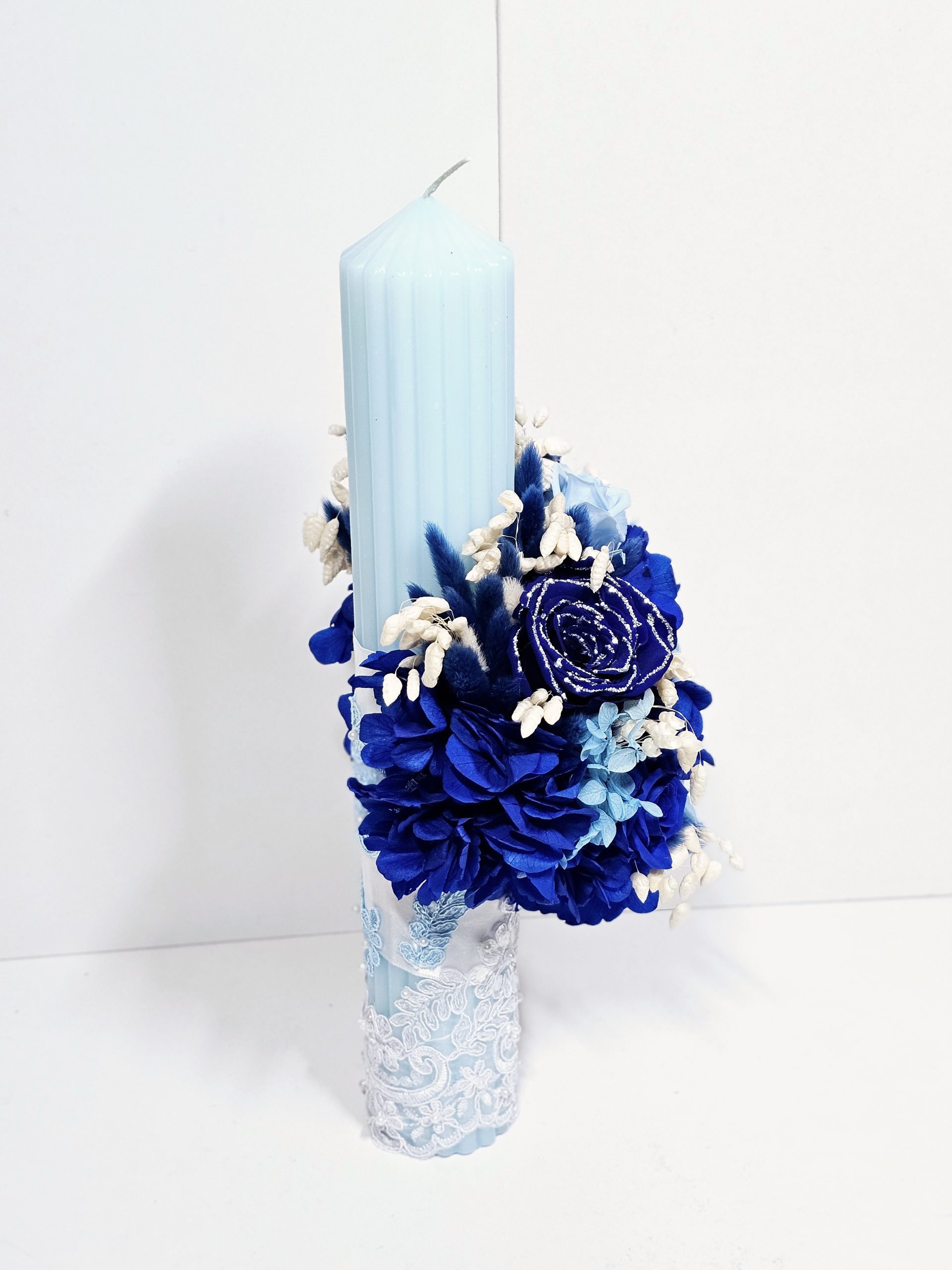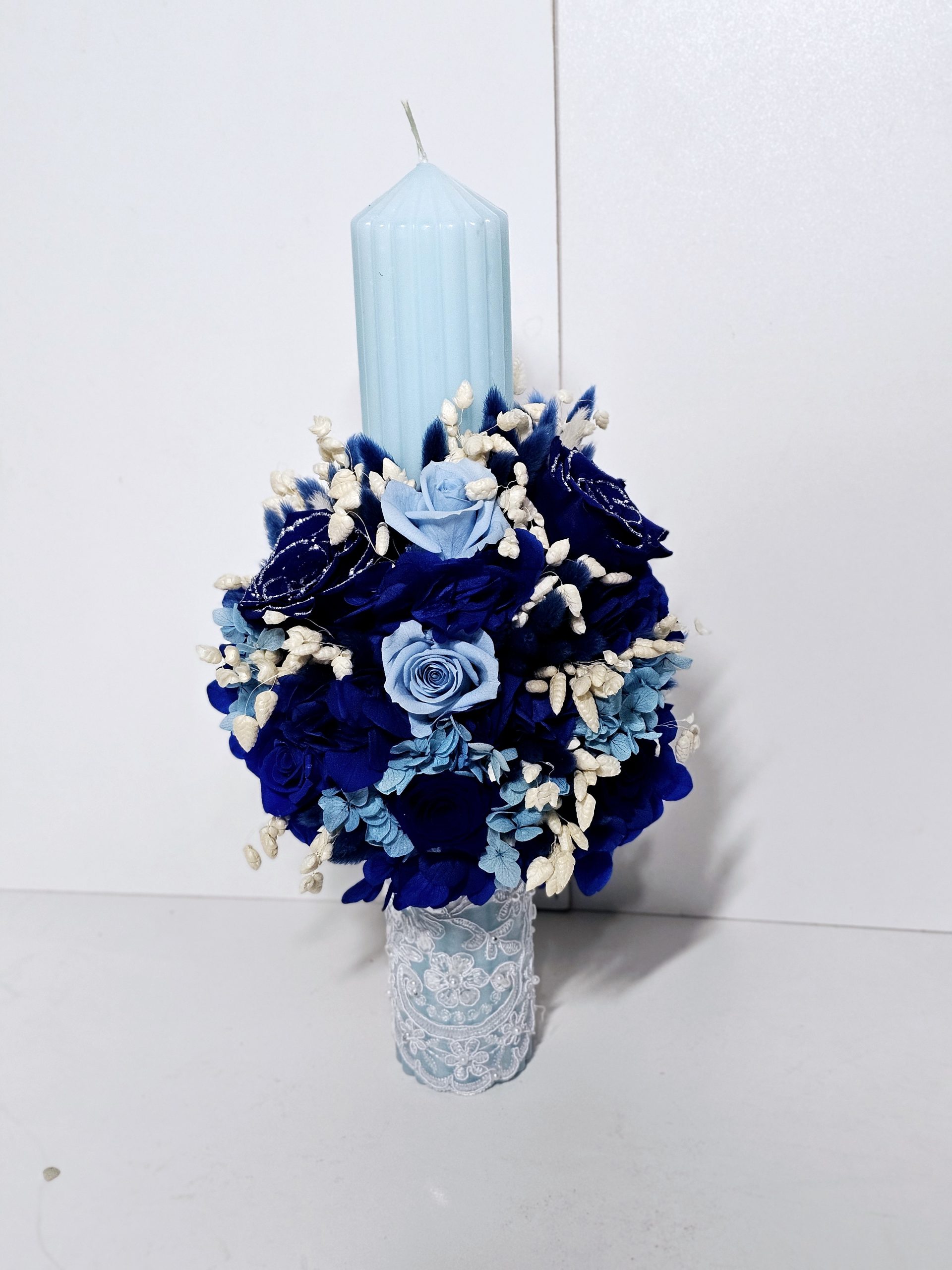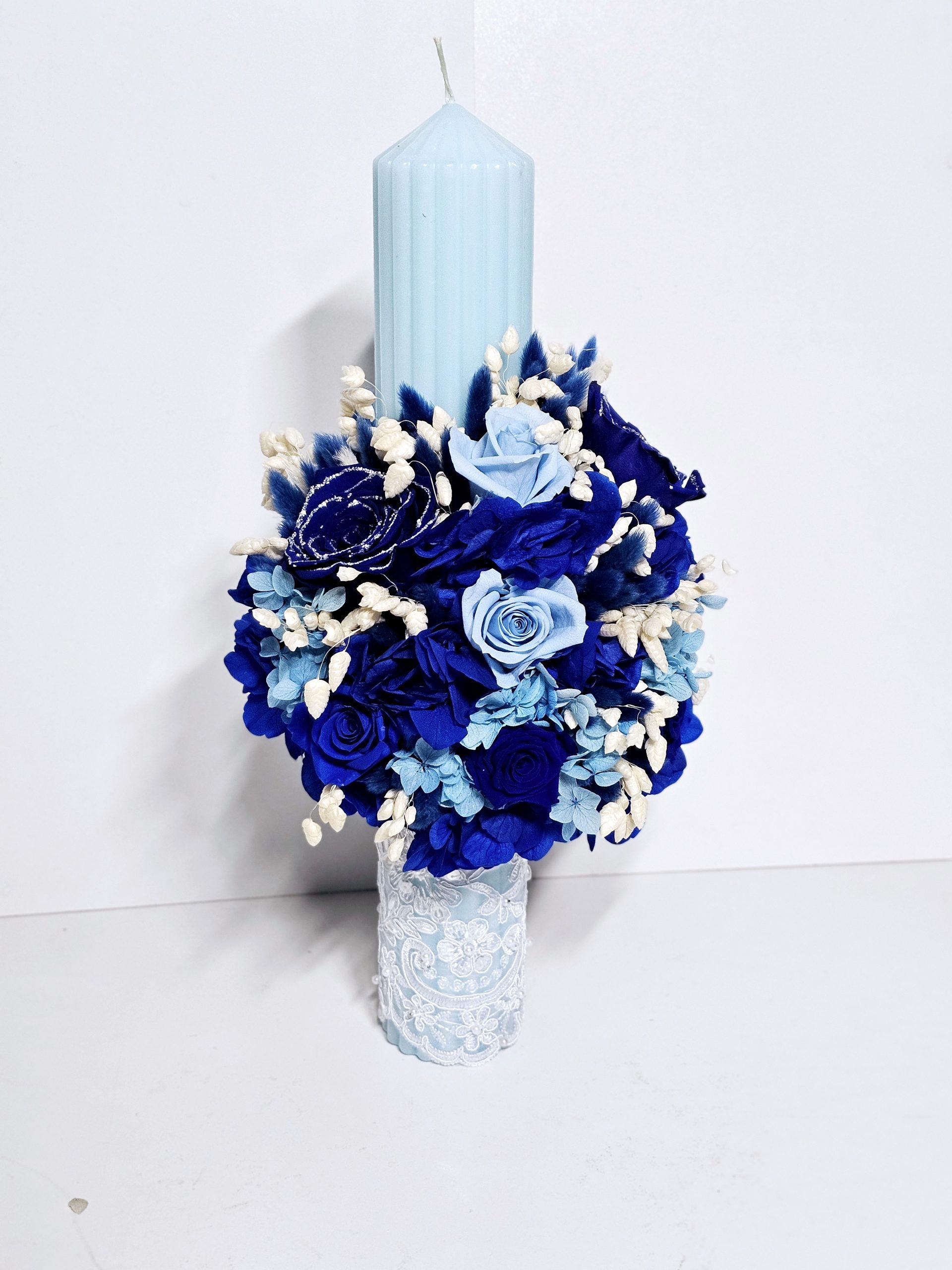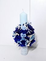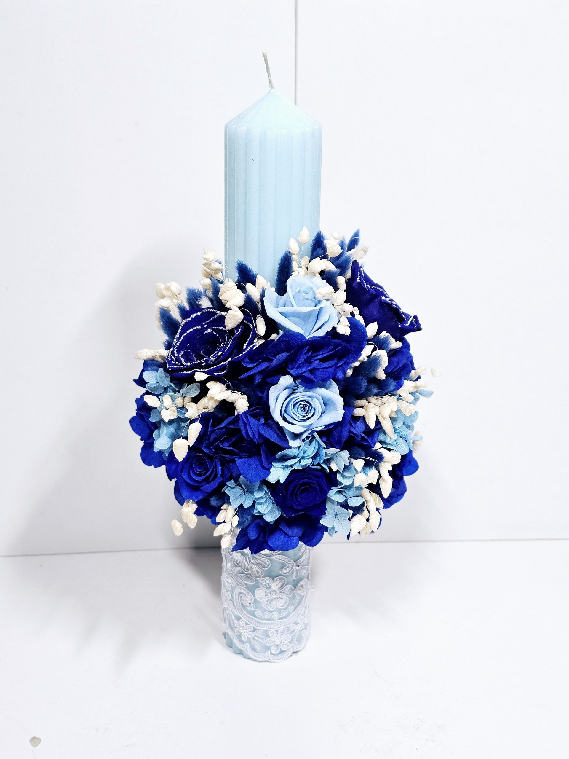 Lumanare decorata cu flori uscate si criogenate, ce contine cinci trandafiri criogenati. Culori predominante albastru royal, rosu-aprins, roz-pal, ivoire si alb.