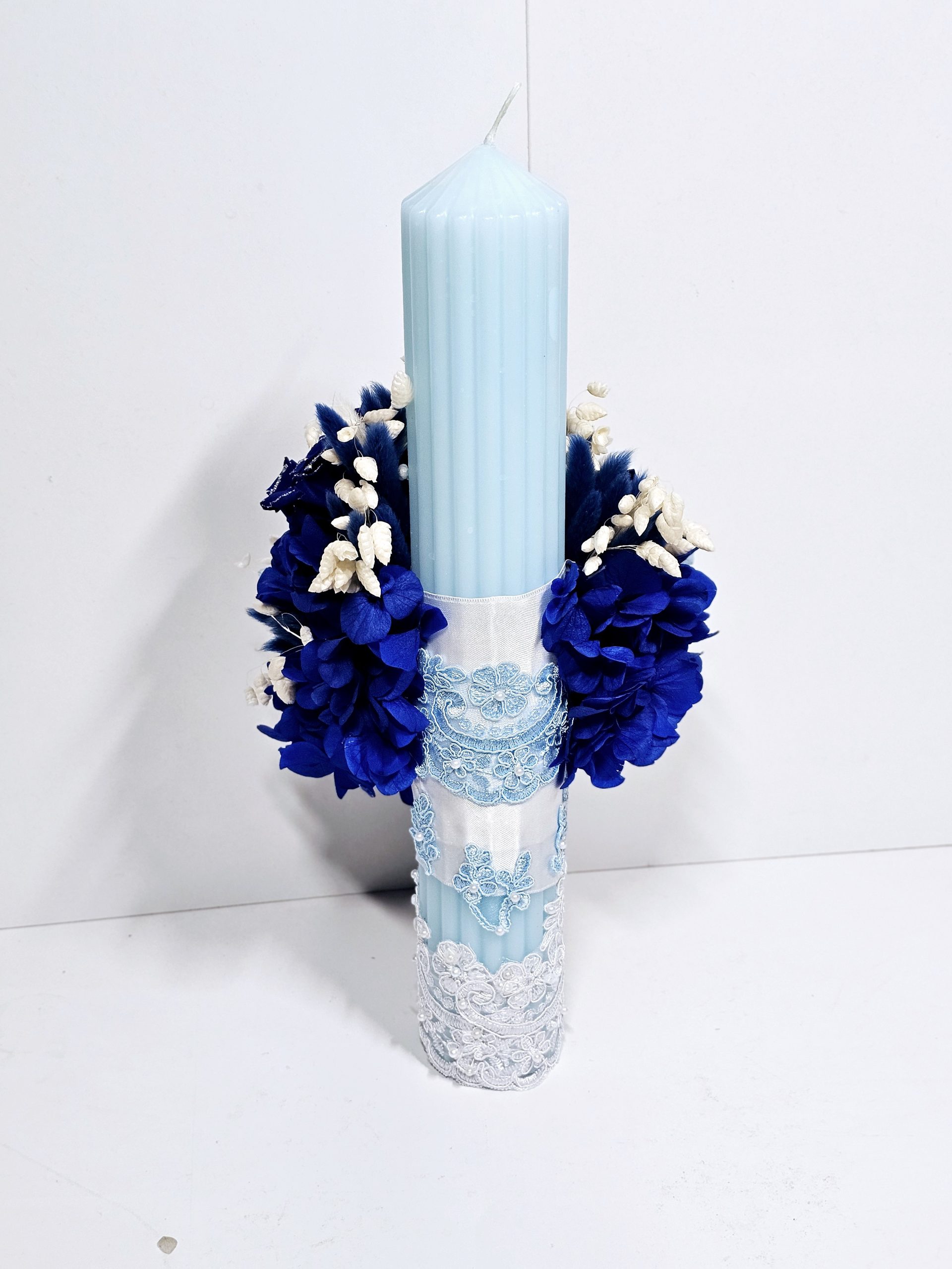 Lumanare de botez, din parafina, de tip stea, decorata cu flori criogenate si uscate, ce contine 7 trandafiri si hortensie criogenata. Culori predominante bleu si albastru royal.