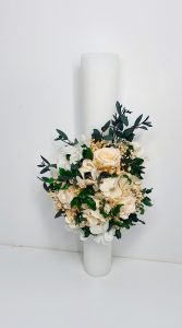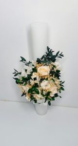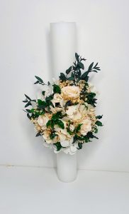 Lumanare decorata cu flori criogenate si uscate, ce contine trandafiri criogenati, hortensie, eucalipt. Culori predominante crem, crem-sampanie, alb, verde si ivoire.