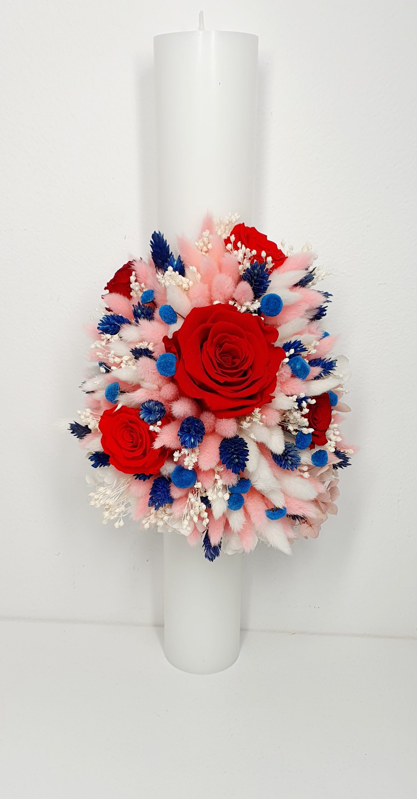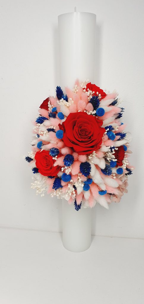 Lumanare decorata cu flori uscate si criogenate, ce contine cinci trandafiri criogenati. Culori predominante albastru royal, rosu-aprins, roz-pal, ivoire si alb.