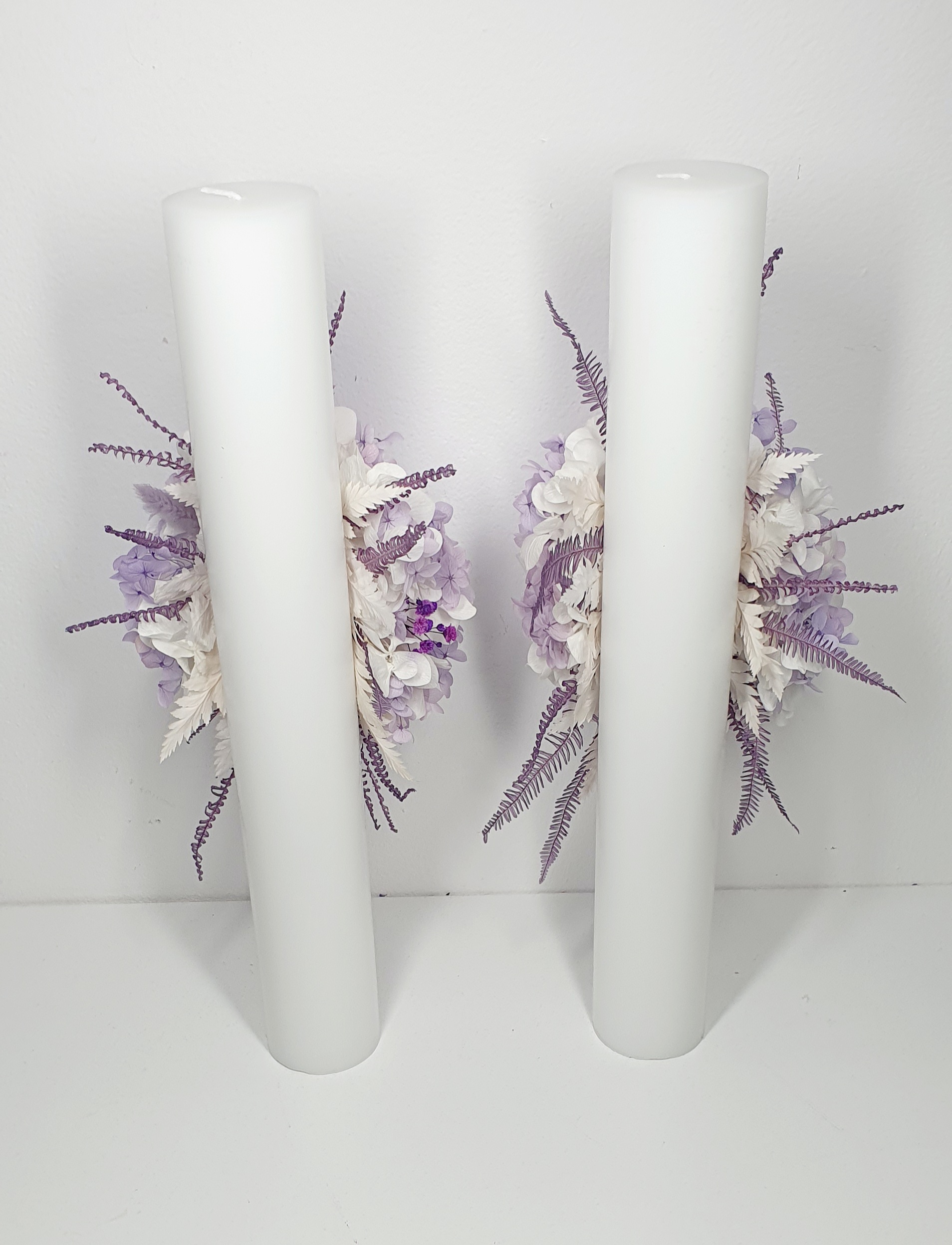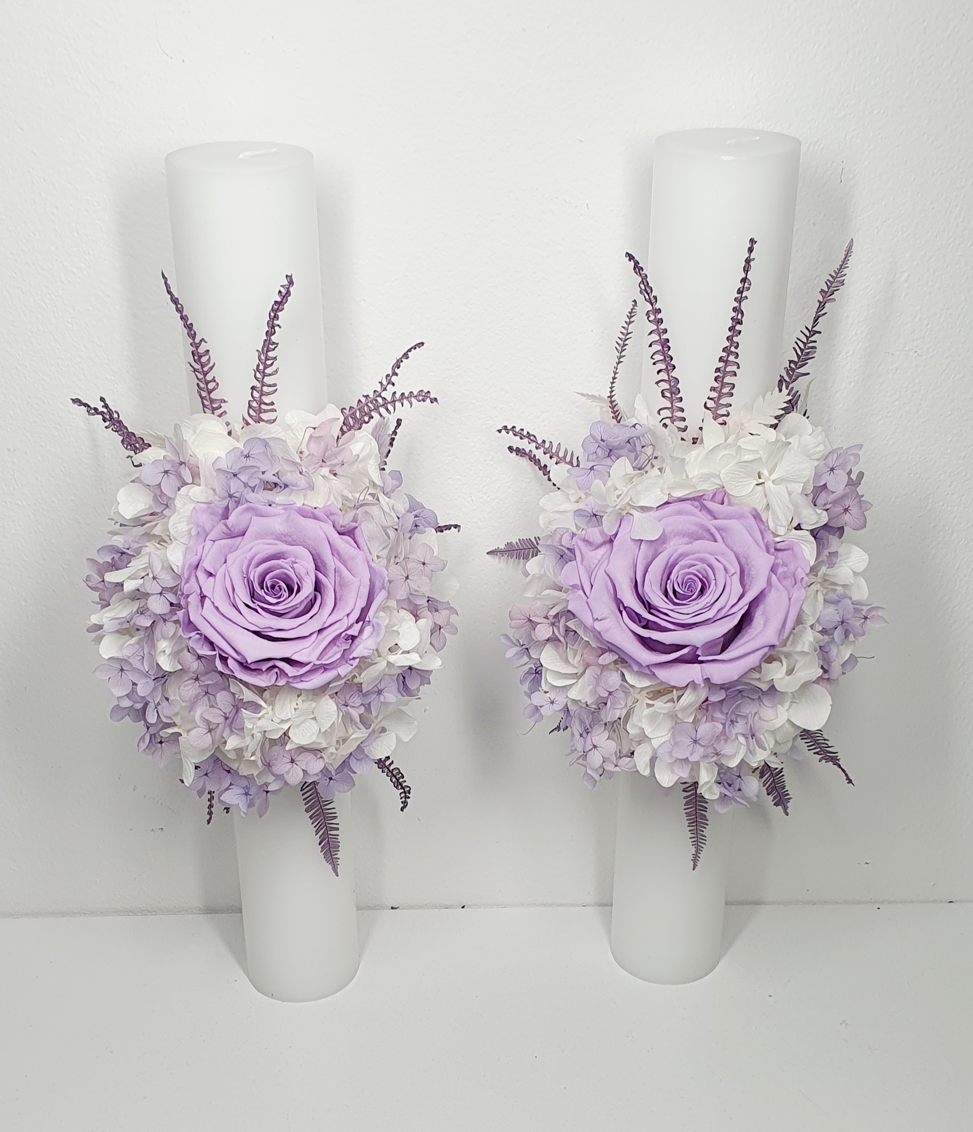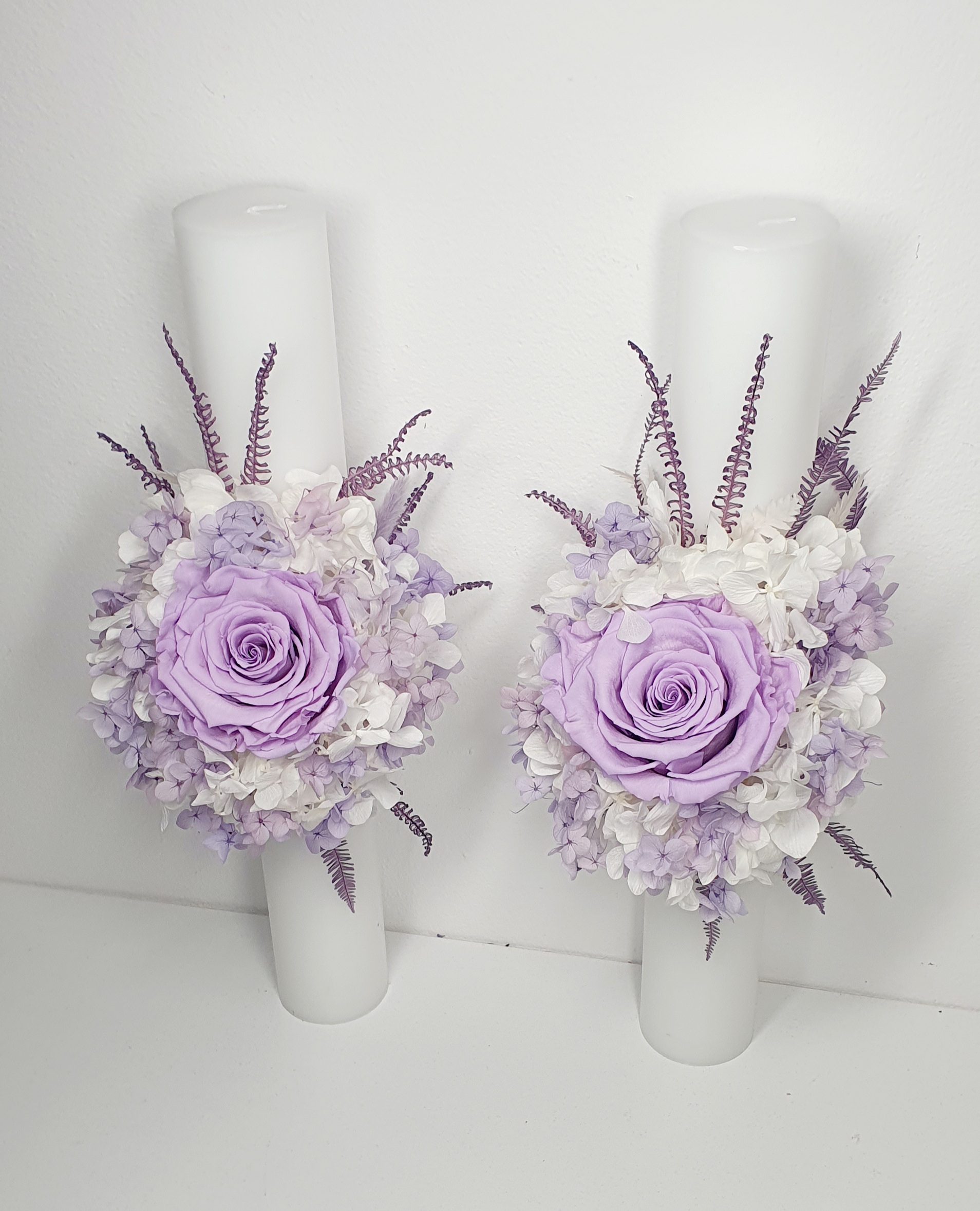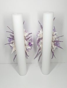 Set de lumanari personalizate si decorate cu flori criogenate, ce contin cate un trandafir de 7 cm diametru, hortensie, lavanda si floarea-miresei criogenata. Culori predominante mov, indigo, lila si alb.