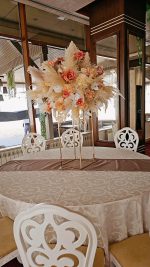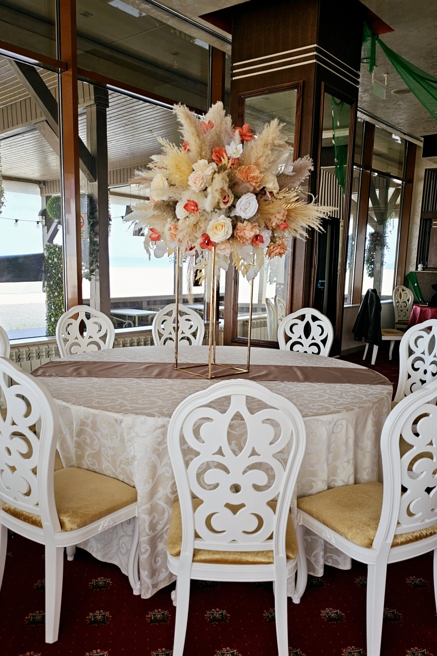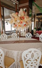 Stalp metalic decorativ sub forma dreptunghiulara (auriu) cu decor realizat din pampas natural si flori artificiale. Culori predominante crem, bej, ivoire, alb, caramiziu, portocaliu, terracota etc.